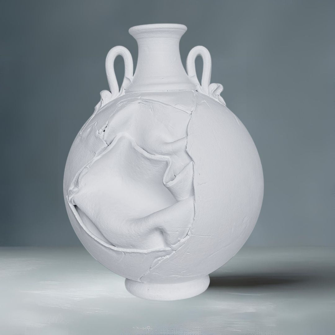 The piece presents a near-perfect, spherical form that is suddenly, softly collapsed inward on one side, as if in a moment of release or introspection. This dramatic fold is unified and purified by a continuous, chalky white finish. The absence of colour strips the form down to its essentials, creating a canvas of pure texture where light and shadow can describe the landscape of its surface—from its smooth curves to its crumpled, vulnerable heart.