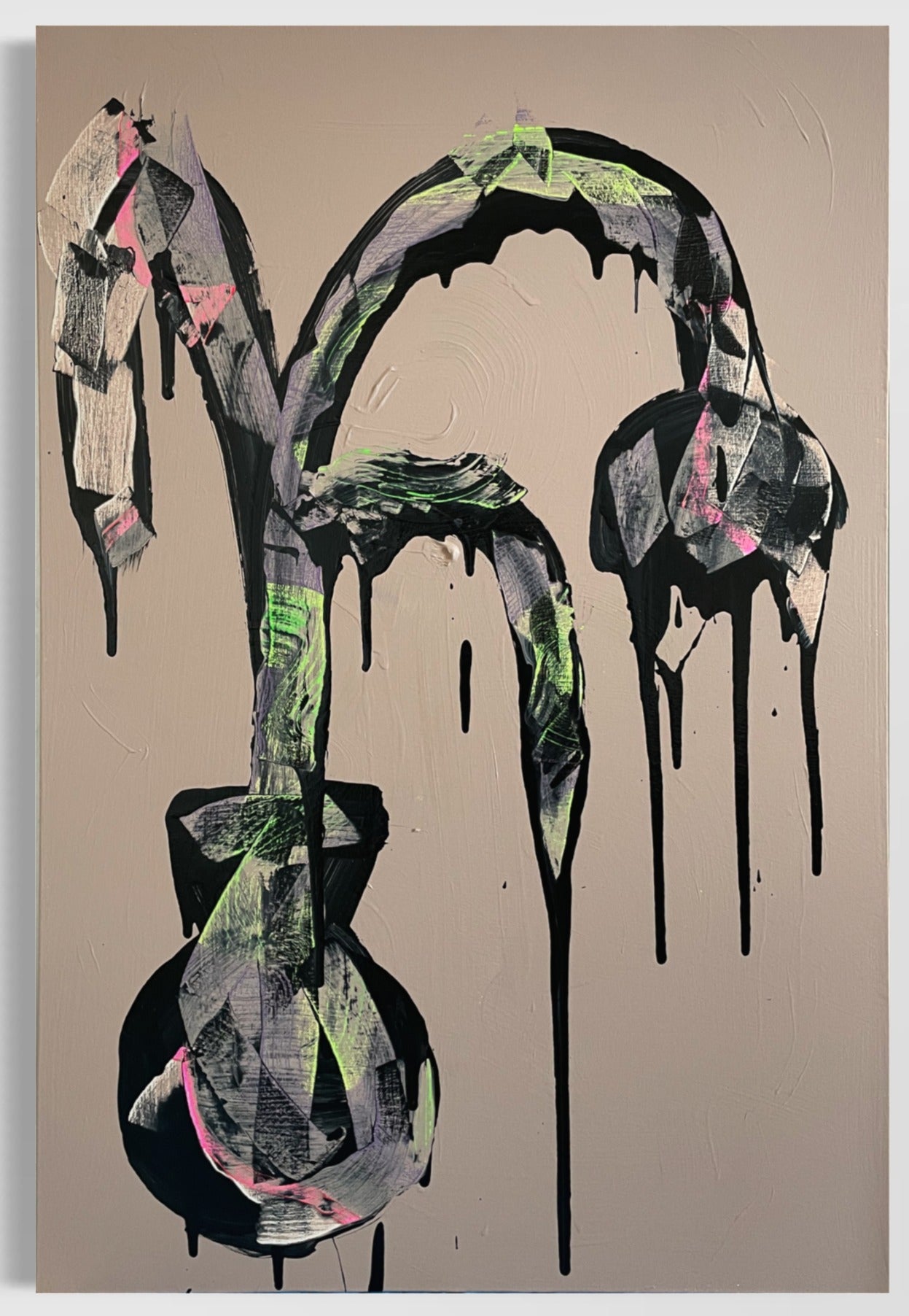 A singular bloom bows with palpable gravity, its form degrading in cross-hatched static and dripping black impasto. Yet, this somber decay is pierced by flashes of acidic green and raw pink—the stubborn, defiant energy of a wildflower cracking through concrete.